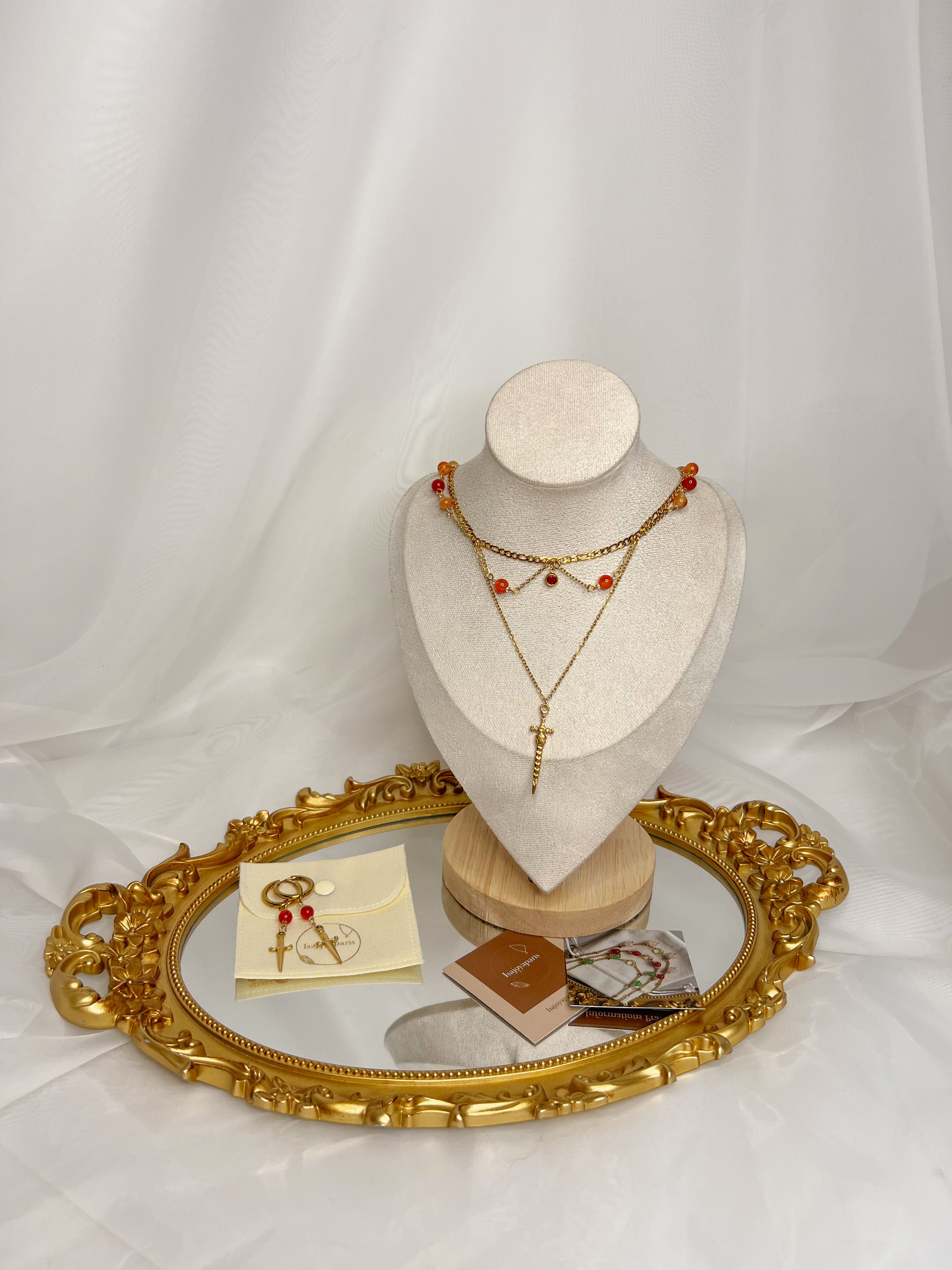 Voir le collierLe collier Morrigan en grenat almandin s’inspire de la déesse celtique du même nom, symbole de puissance et de transformation. Il réveille la guerrière qui est en vous, stimule la confiance en soi, la persévérance et la force intérieure, pour vous accompagner dans vos combats du quotidien.