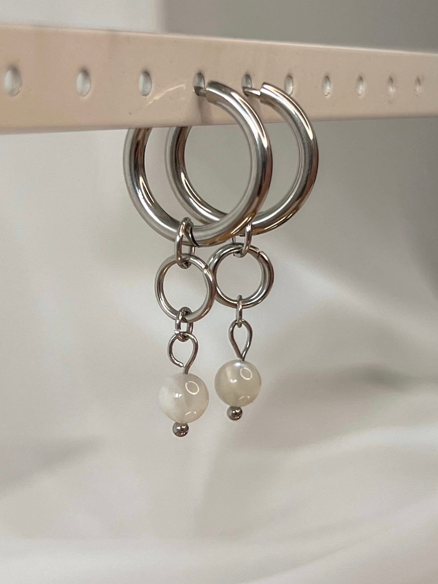 Ces boucles d’oreilles sont réalisées en acier inoxydable, les pierres étant uniques l’intensité ou le motif de celles-ci peut varier d’une perle à une autre.