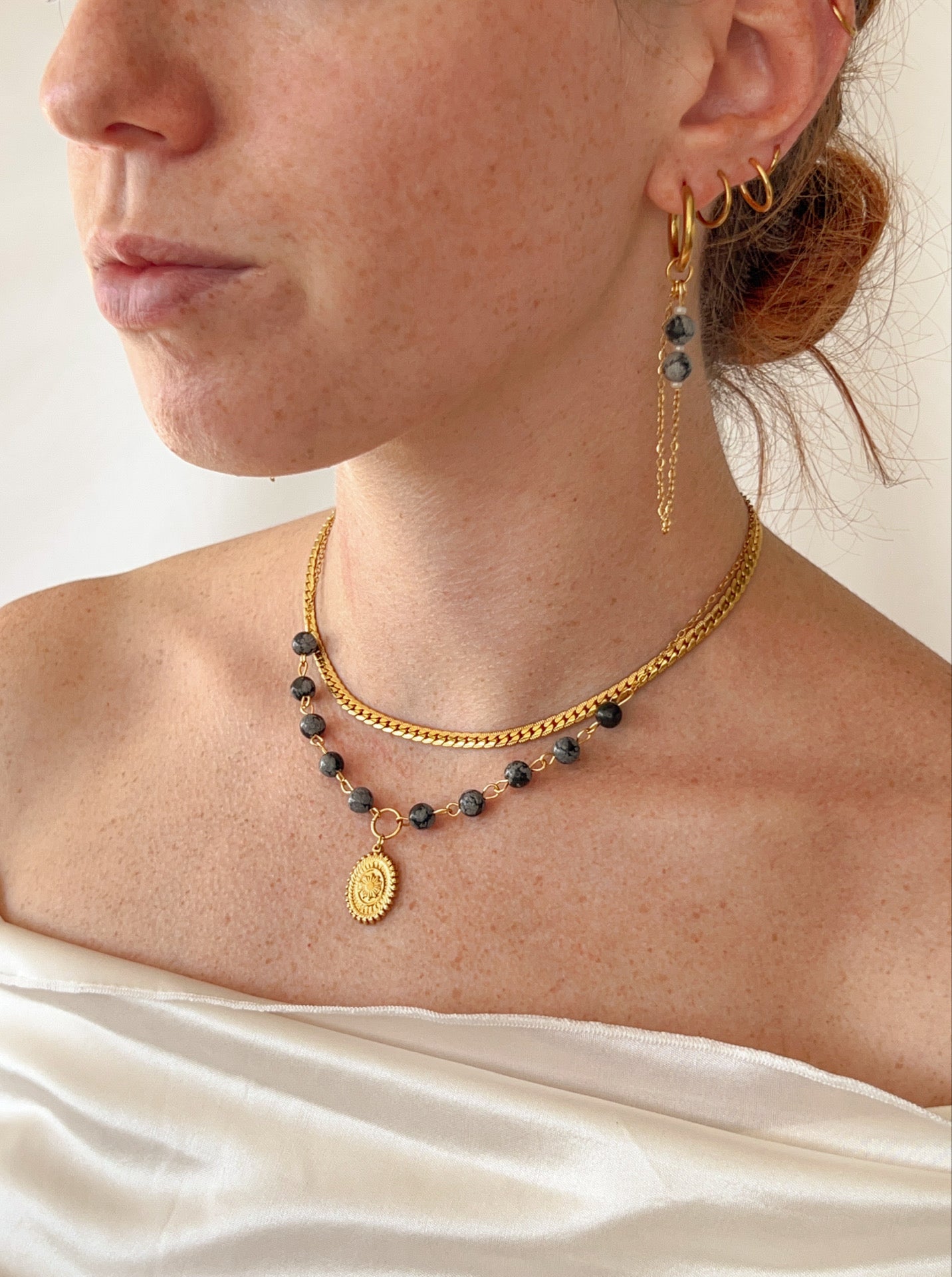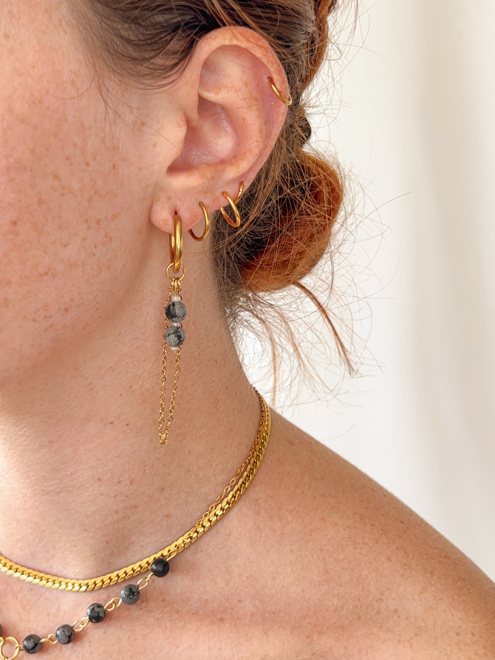 Les boucles d’oreilles Syloria en obsidienne neige sont une invitation à se libérer de la timidité et des rancœurs, à porter quotidiennement. Toutes les boucles d’oreilles sont interchangeables, il est possible de sélectionner seulement les pendants (sans les créoles).