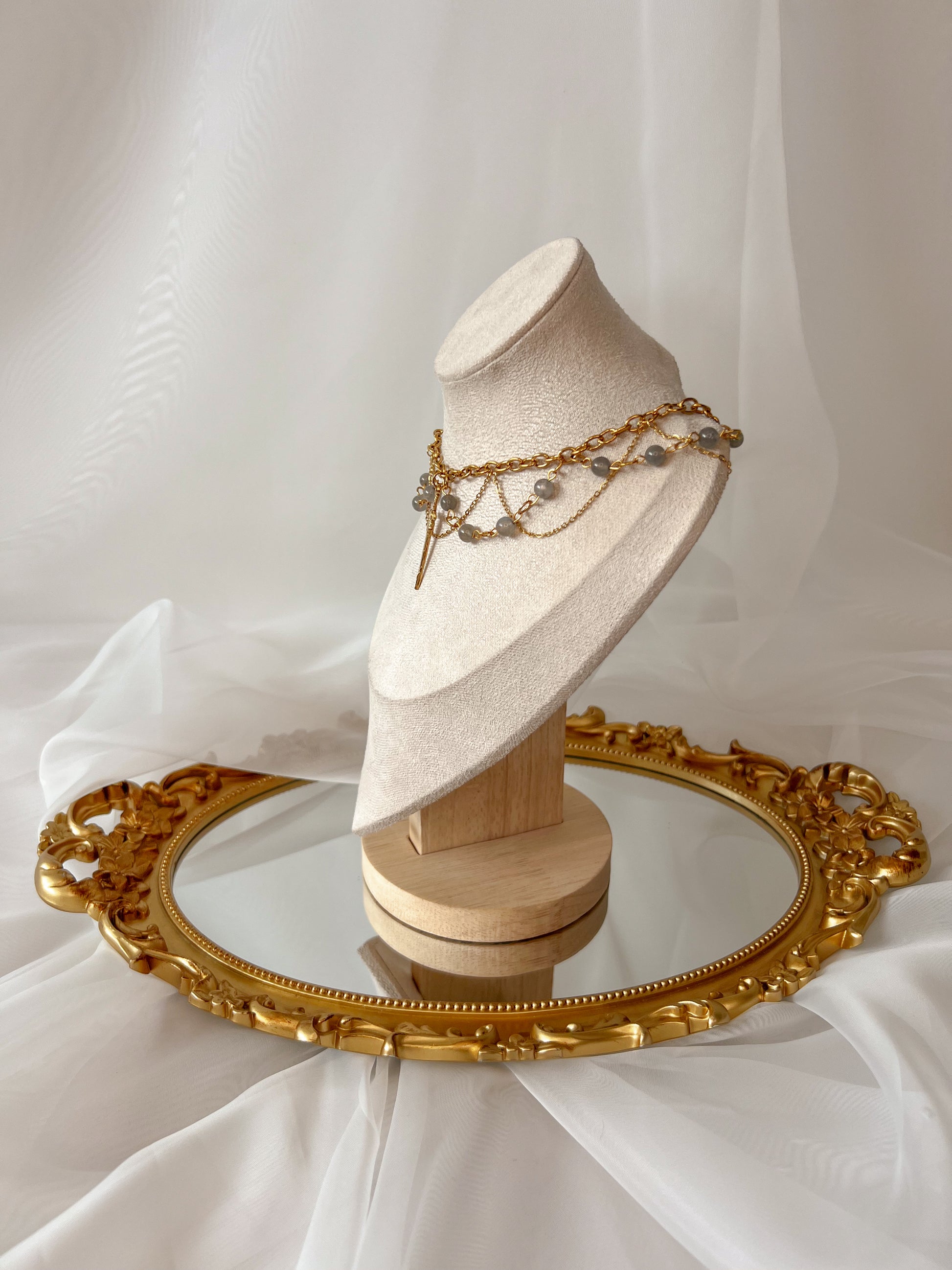 Le collier Impérial, orné d’une épée dorée, incarne l’alliance de la guerrière et de la reine qui sommeille en chacune. Orné de Labradorite il vous protègera des énergies négatives et aidera à apaiser le stress et l’anxiété. Portez ce collier comme un symbole de force et de protection.
